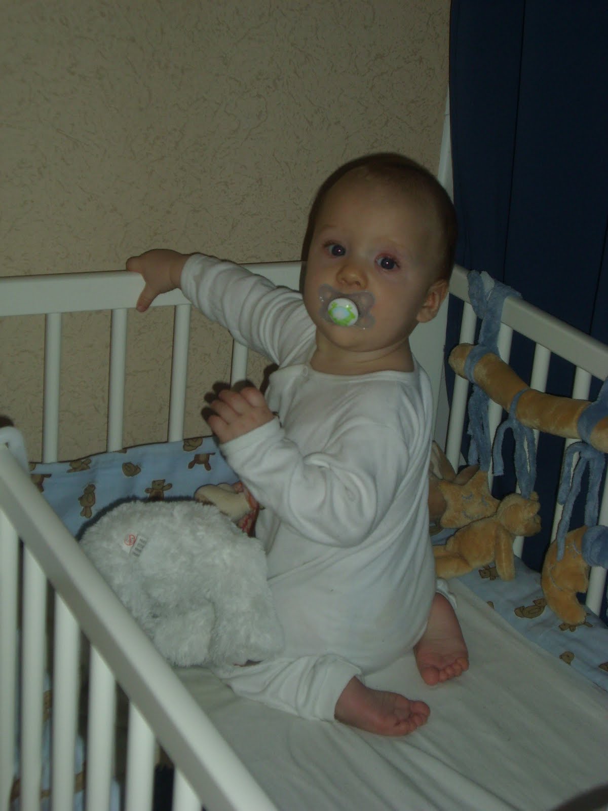 Sitter utan stöd, ålar med raketfart och stiger upp till knäna med stöd. Han klättrar på allt, speciellt roligt är det att klättra på brorsan. Han älskar Arthurs leksaker som spelar (men Arthur låter honom inte ha dem) och är nöjd för det mesta. De två nedre framtänderna har han också (och det tog bara mycket över 2 månader för dem att komma igenom). Han är en observerare och följer med så noga så. Han är mycket mindre intresserad av mig och lek med mig än vad Arthur var, han ska titta på allt annat, speciellt Arthur.
